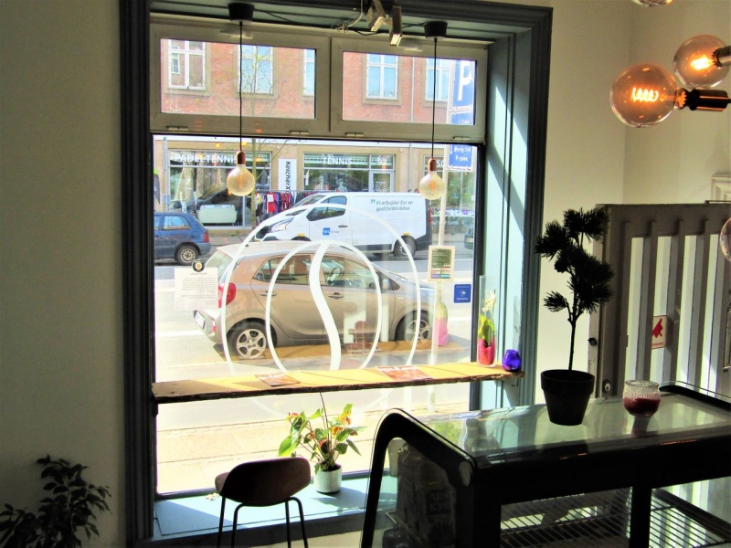 Det første du møder er forrummet hvor gæsterne bestiller sin mad. Herefter kan maden nydes i barstolene ved vinduet med kig ud til den pulserende Peter Bangsvej.