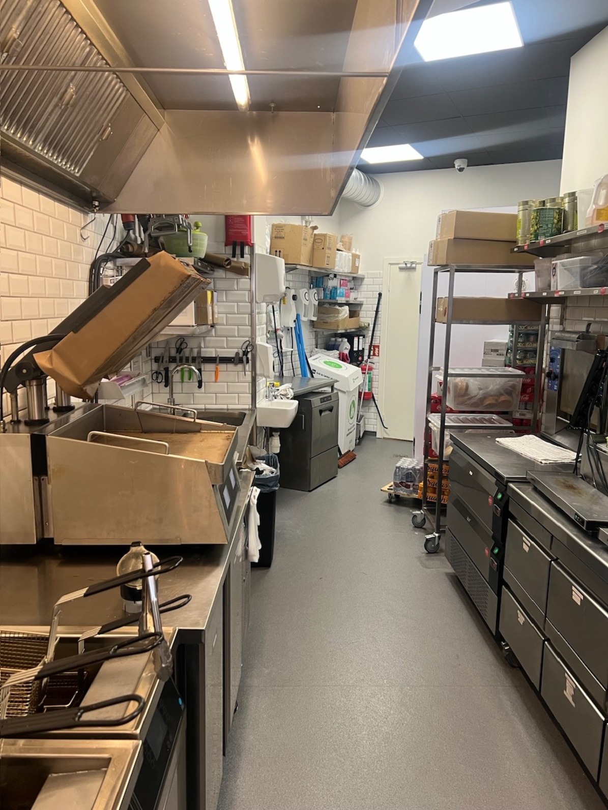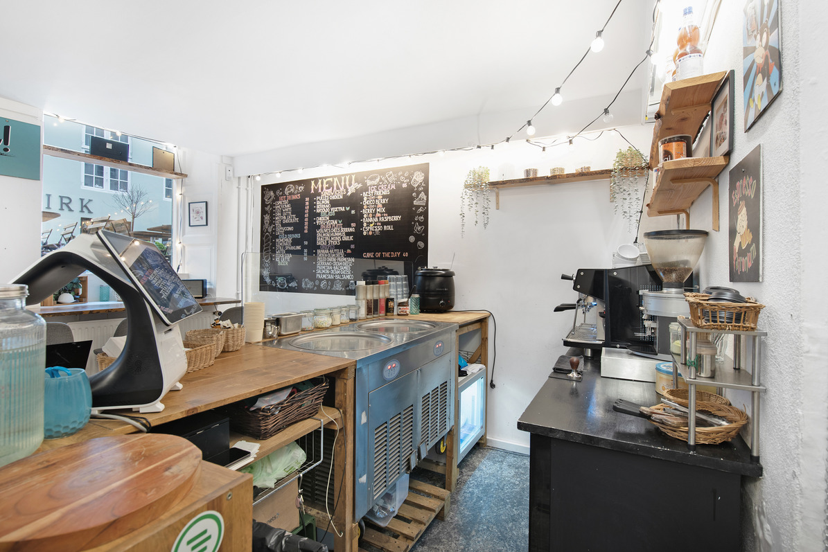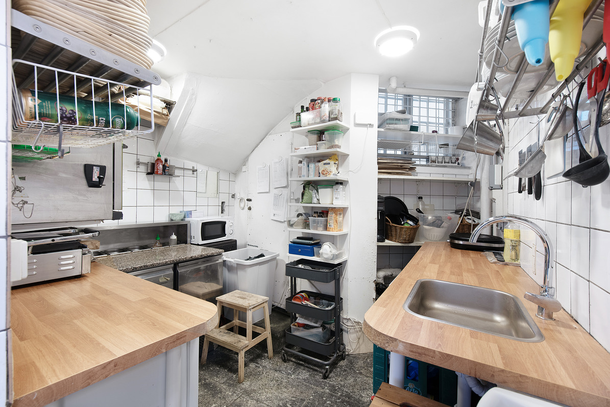 Forrest i forretningen betjenes kunderne og bagerst får du et rigtigt godt udstyret køkken med masser inventar.