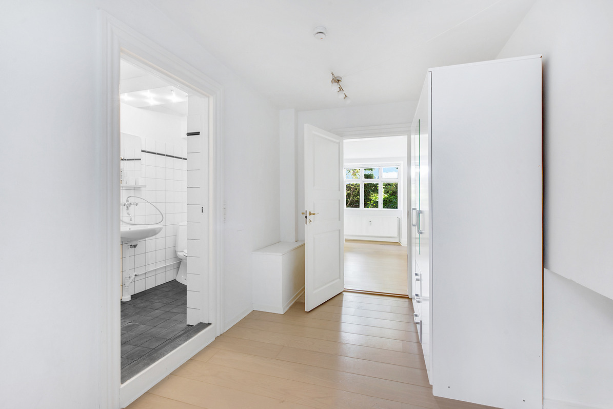 Du mødes af et fint lokale med nylagt gulv direkte ud til Emdrupvej.